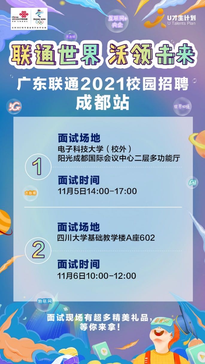 广东联通2021校园招聘正在火热进行中!【"Wo"是谁,有一说一】世界500强(排名290名)互联网+央企,活跃创新包容,我们非同一般!5G、AI、大数据、物联网、云计算,你感兴趣的领域我们都很强!首家集团层面整体推进混改的央企全国通信产业榜省级运营商联通系统第1名全集团各省分公司收入规模第1名、绩效考核第1名【生活不易,联通顺意】入职即发3千启航津贴,每年晋升、三年3级专享定制带薪培训,专属1对1导师引领报销在职研究生学费,考取资质证书全报5年免费宿舍/住房补贴,食堂三餐都搞定七险二金,意外、重疾保险可保全家法定7大假期,不提倡加班,终身话费流量免费用岗位可轮换,向上可竞聘,超多成长路径【招聘天团,面试来袭】我们将于11月6日10:00在a漫 (望江校区)基础教学楼A座602举办“现场面试双选会”,只要你敢来,我们最快2天发Offer!