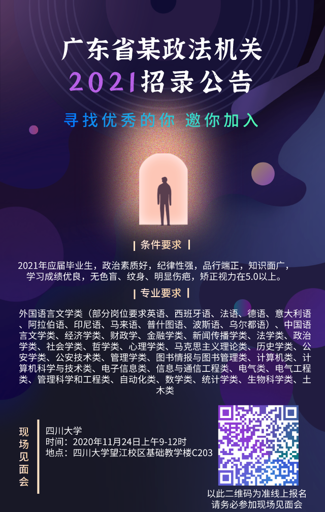 11月24日上午9:00在望江校区基础教学楼C203进行广东省政法系统公务员招录,此次招录是全广东省本系统的统一招录,学生可选择深圳、广州、佛山等属地单位,全省系统内只有这一次招录见面会,招录人数很多。