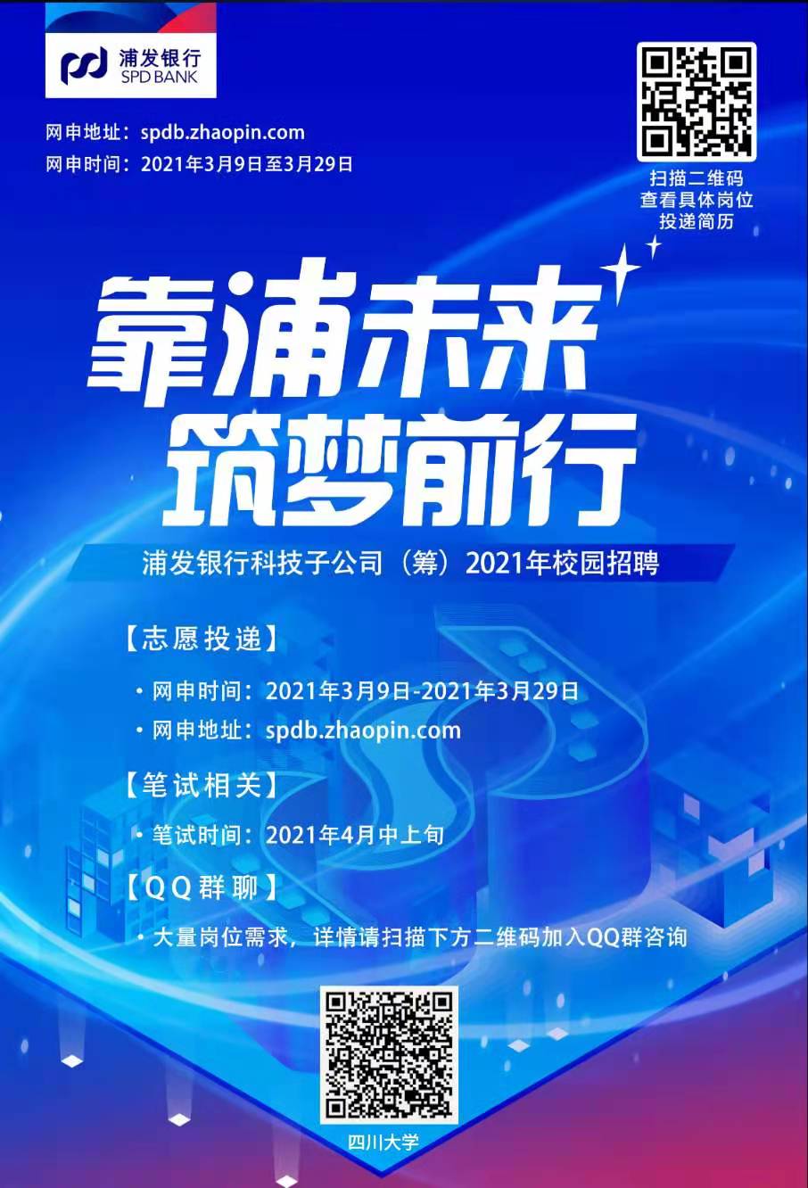#浦发银行科技子公司(筹)2021年春季校园招聘正式开始啦#毕业季如约而至,你准备好了吗?机遇当前,乘势而上科技引领,浦写未来我们正在寻找与众不同的你!简历投递时间:3月9日-3月29日简历投递地址:spdb.zhaopin.com(见图二维码)岗位方向:软件开发、大数据、信息安全、UI设计、技术管理、创新实验室、综合管理六险二金,节假日福利,周末双休还在犹豫什么!快来加入我们,成为靠浦青年吧!