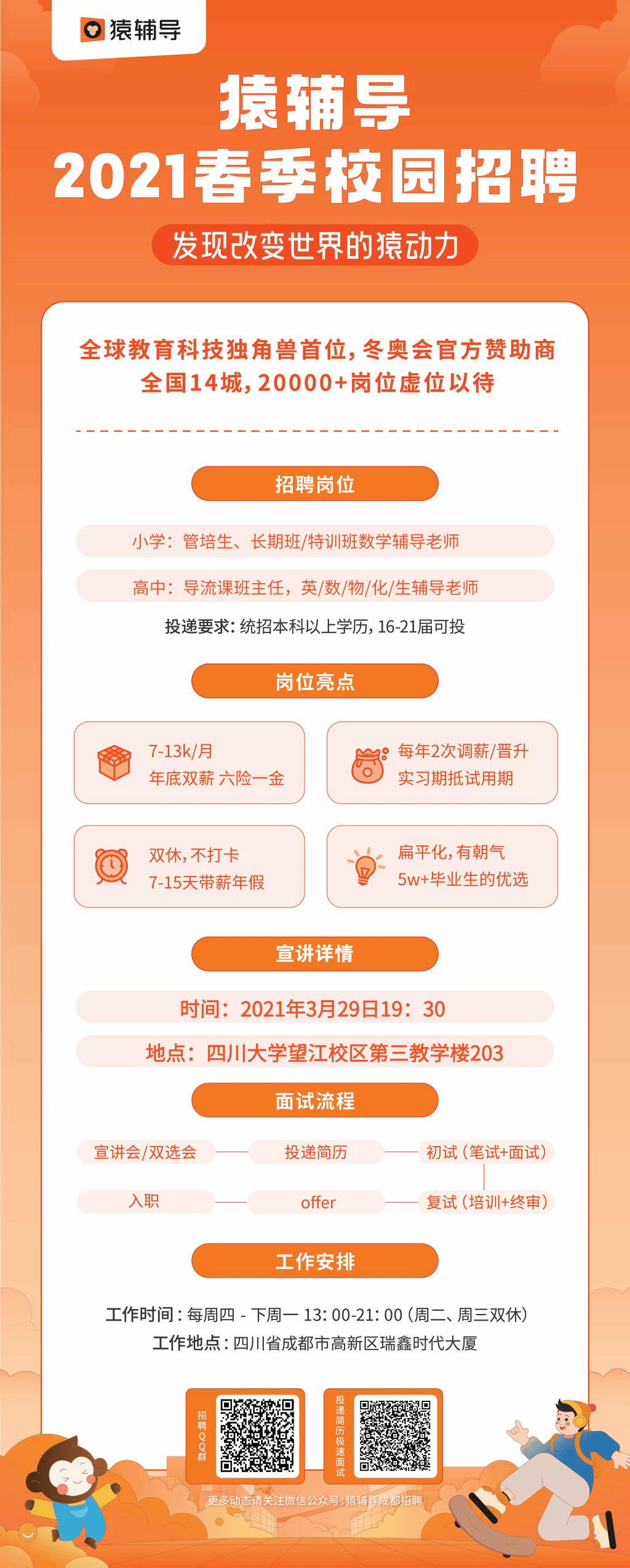 猿辅导成立于2012年,总部位于北京,目前在成都、武汉等 13个地区设立分公司,是国家级高新技术企业,公司成立7年来,员工上万名,获得来自腾讯、IDG资本、经纬中国等著名投资机构投资,目前估值超过155亿美元。成都分公司目前拥有超过2000人的团队及4000平的办公环境。