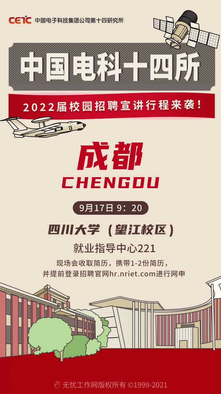 中电14所2022届校园招聘a漫 专场宣讲会将于9月17日(周五)9:20-11:20,在就业指导中心221进行,现场收取简历,17日(周五)下午会在就业指导中心217、218进行面试。请提前登录官网:hr.nriet.com进行简历网申,也欢迎各位小伙伴邀请自己的小伙伴进微信群,了解更多宣讲会详情和招聘资讯哦!