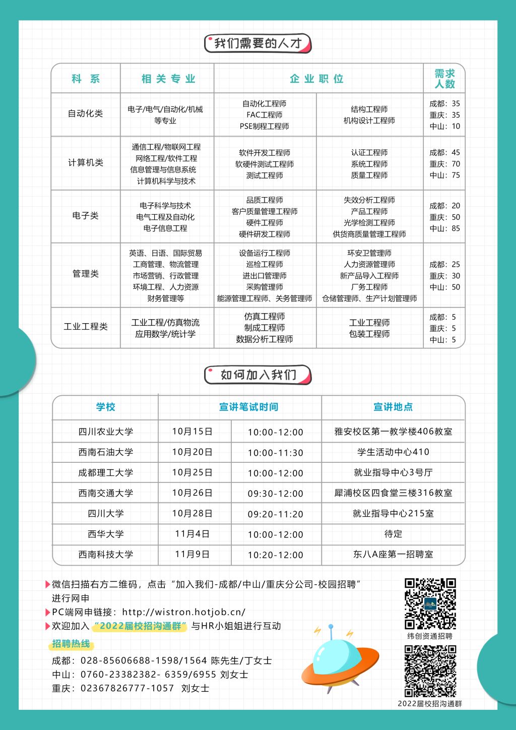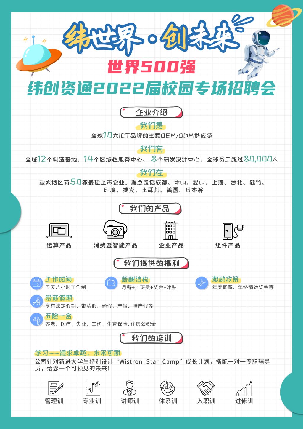 因学校疫情防控政策,纬创原定10/28上午在就业指导中心215室宣讲会已取消,现诚邀各位同学参加纬创资通2022届校招空中宣讲会(a漫 专场)宣讲方式:腾讯会议宣讲主题:纬创资通2022届空中宣讲会(a漫 )宣讲时间:2021/10/28 10:00-11:00 (GMT+08:00) 中国标准时间 - 北京