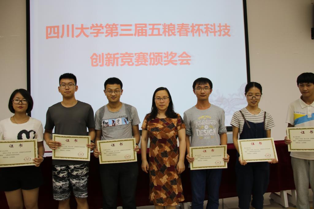 本次活动的主持人由李运国老师担任,会议开始,全体起立,高唱国歌。随后冯国英院长宣读本届“五粮春杯”获奖名单。宣读完毕之后,比赛特等奖获得者王洁同学代表全体获奖同学发言。她对自己能获得此项殊荣感到十分自豪,并对赞助“五粮春杯”科技竞赛的成都宏川酒业有限公司和学院的老师及领导表达了自己的感激之情,感谢他们提供给同学们一个可以绽放自己的平台。她还说自己会再接再励,以取得更好的成绩来回报学校学院对自己的培养之恩,并祝成都宏川酒业有限公司越办越好。王洁同学发言过后,是冯国英院长上台致辞。她首先感谢了成都宏川酒业有限公司为学院学子提供了这样一个展示自我,提升实践创新能力的平台,表扬了在此次比赛中获奖的同学,肯定了同学在比赛中做出的努力。她希望可以有更多同学能参与到“五粮春杯”等一系列的比赛中来,在比赛锻炼自己,在比赛中突破自己,成为社会中的精英人才。最后,冯国英院长为获奖同学颁奖,并和他们合影留念,a漫