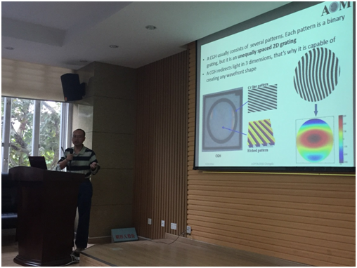 在问答环节,老师和学生踊跃提问,从CGH的光学设计,到制作工艺,再到测量精度,问题涵盖了CGH技术的方方面面。对于所有提问,Dr. Zhao都一一作了详尽的解答。最后,报告会在师生们的意犹未尽中结束。