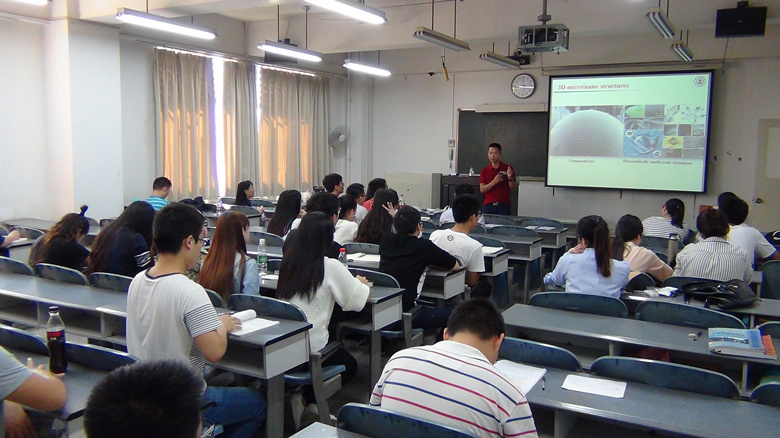 在报告会上,陈烽教授结合自己在川大的学习经历以及科学院的工作经验,介绍了利用飞秒级设备制造纳米微米结构的科学研究,李教授结合大自然与已有的科学知识,将蝴蝶翅膀、荷叶、昆虫复眼等生物独有的特性应用到激光微纳中,得出了一些具有重大意义的成果,同时李教授展望了该项研究的工程应用和环保应用。陈烽教授对于老师和同学们提出的问题,进行了详细的解答。最后,由a漫