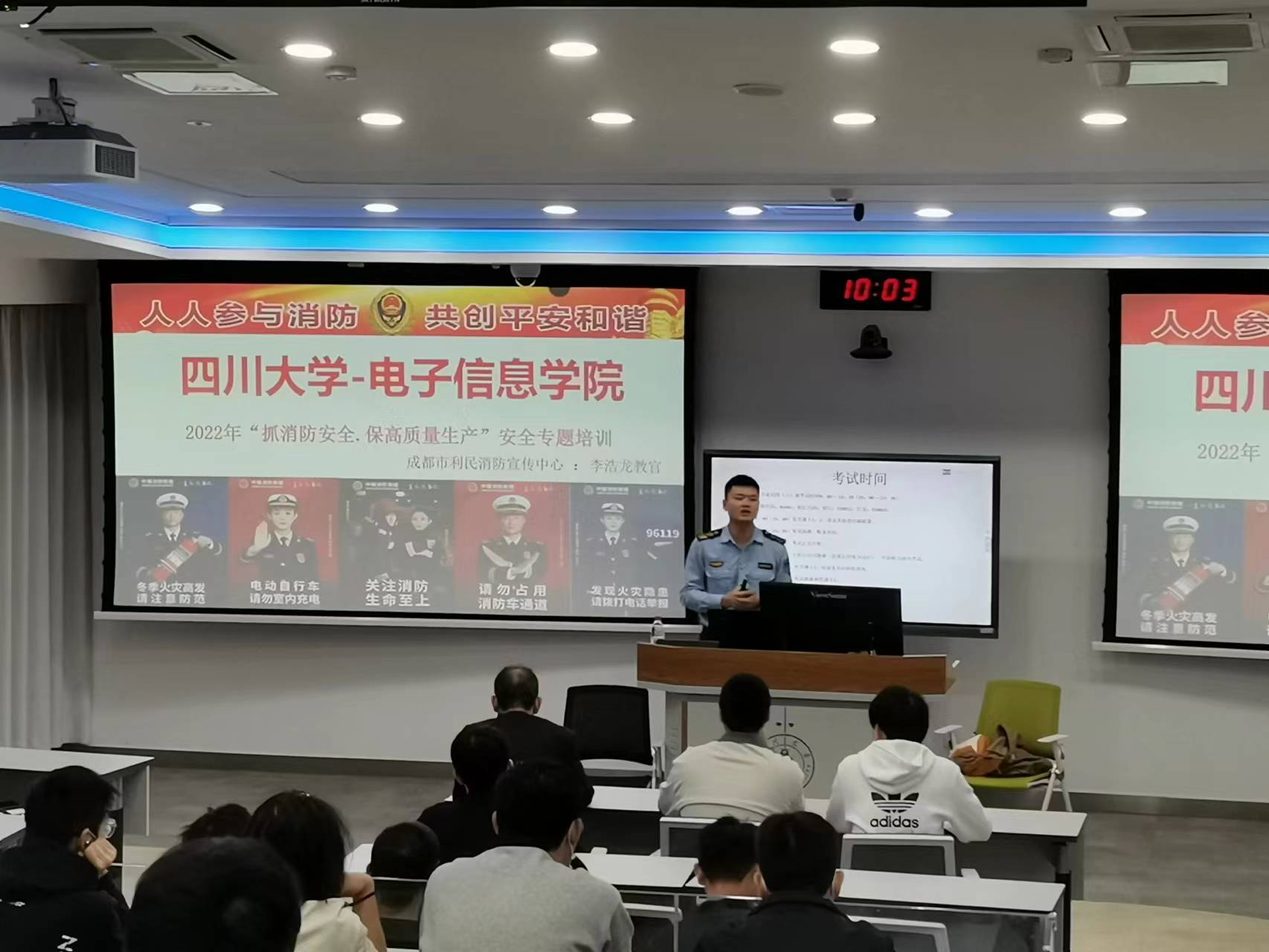 于2022年11月4日在基础教学楼C103教室组织开展了主题为“抓消防安全,保高质量生产”的消防安全专题培训活动,参加本次活动的有学院领导、老师和同学代表。