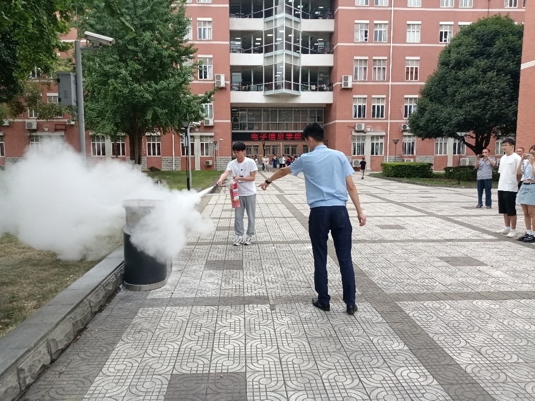 专题培训后,张浩教官和全体参训人员一起开展了灭火器的使用方式演练,让参加培训的师生更进一步的了解了灭火器的使用方法。