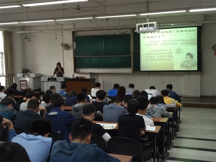 在101教室,陈林老师先向同学们讲述了学院篮球赛上的一个案例,引起了同学们对于安全问题的重视。然后陈林老师用PPT幻灯片向同学们展示了校园里容易出现的一些安全问题,并着重强调了体育运动方面的安全,同时告诫同学们要有安全意识和保险意识。